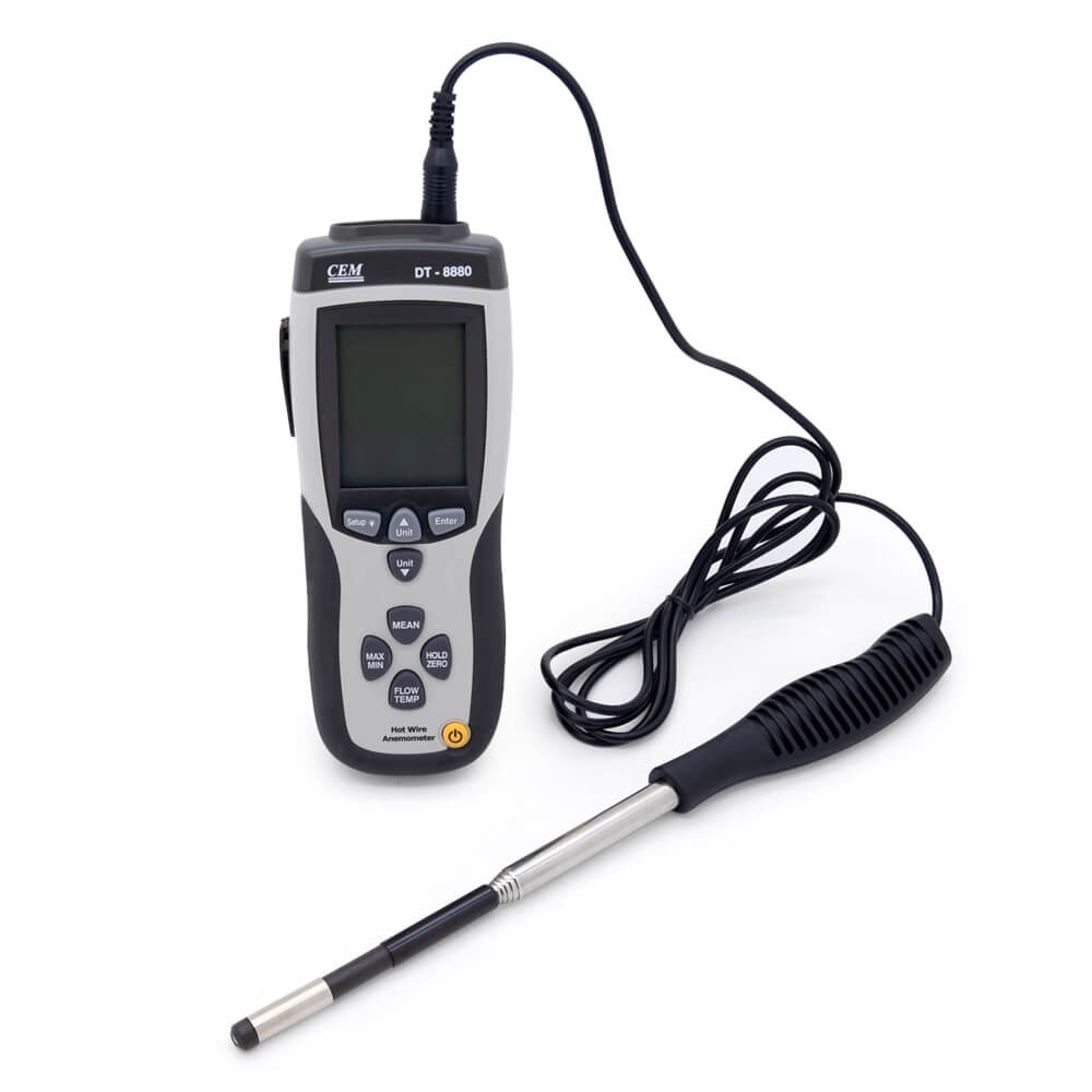 Портативный анемометр предназначен для применения в бытовых и промышленных целях для замеров характеристик вентиляционных систем. Прибор оснащен тепловым измерительным датчиком диаметром 10 мм на телескопической штанге. Такая конструкция облегчает процесс измерений в коробах вентиляционных систем. Прибор сохраняет показания, определяет максимальное и минимальное значения и расчетные характеристики, такие как средняя скорость и объем прокачанного воздуха сквозь заданное сечение. Модель отличает большой ЖК дисплей с подсветкой, простое и удобное пользование. Питание прибора осуществляется от батареи типа «Крона». Функция авто отключения выключает прибор при неиспользовании в течение 15 минут для экономии заряда батареи.