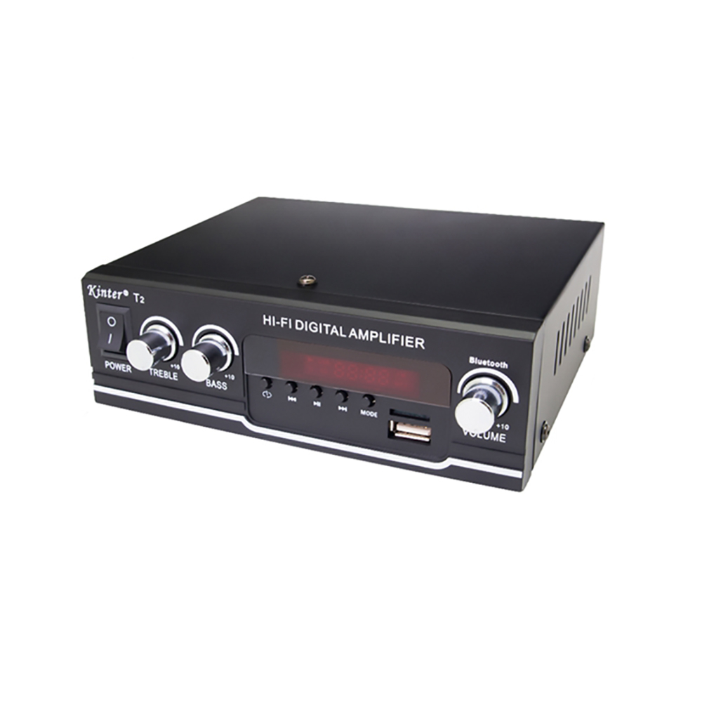 Аудио Bluetooth усилитель мощности Kinter T2 для дома и автомобиля обеспечивает качественное звучание на высоких и низких частотах на любой громкости. Усилитель мощности звука подойдет для авто, для ноутбука, для компьютера, для колонок домашней стерео системы, для наушников. Домашний усилитель оснащен портом USB, через который подключается к устройствам и получает питание от 12 Вольт адаптера или сети 220 В. Также предусмотрена плата Bluetooth для беспроводного подключения. Двухканальный усилитель на ПК имеет мощность 20 Вт на каждый канал. Цифровой усилитель в машину изготовлен из железа. Автомобильный аппарат управляется кнопками на лицевой панели или через пульт ДУ.