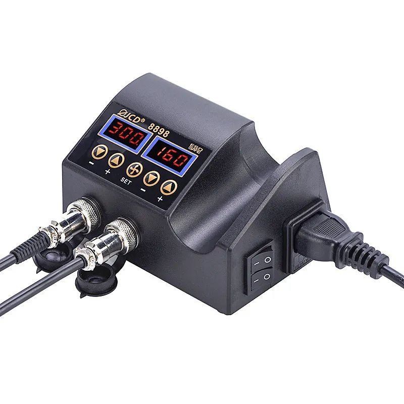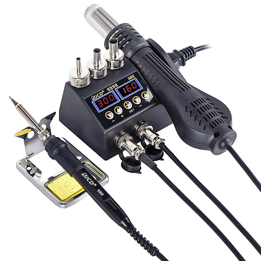 Паяльная станция JCD8898 750Вт применяется для работы методом бессвинцовой распайки. Паяльная станция с феном оснащена двумя цифровыми экранами с подсветкой, на которые выводится температура нагрева. Для продления срока эксплуатации устройства предусмотрено автоматическое охлаждение. Фен паяльник оснащен двумя выключателями на корпусе, которые расположены перед гнездом подключения. Температуру можно регулировать с высокой точностью в диапазоне от 180 до 500 градусов. В комплекте идут станция паяльник фен, 3 насадки разных диаметров и длинный шнур для подключения к сети.